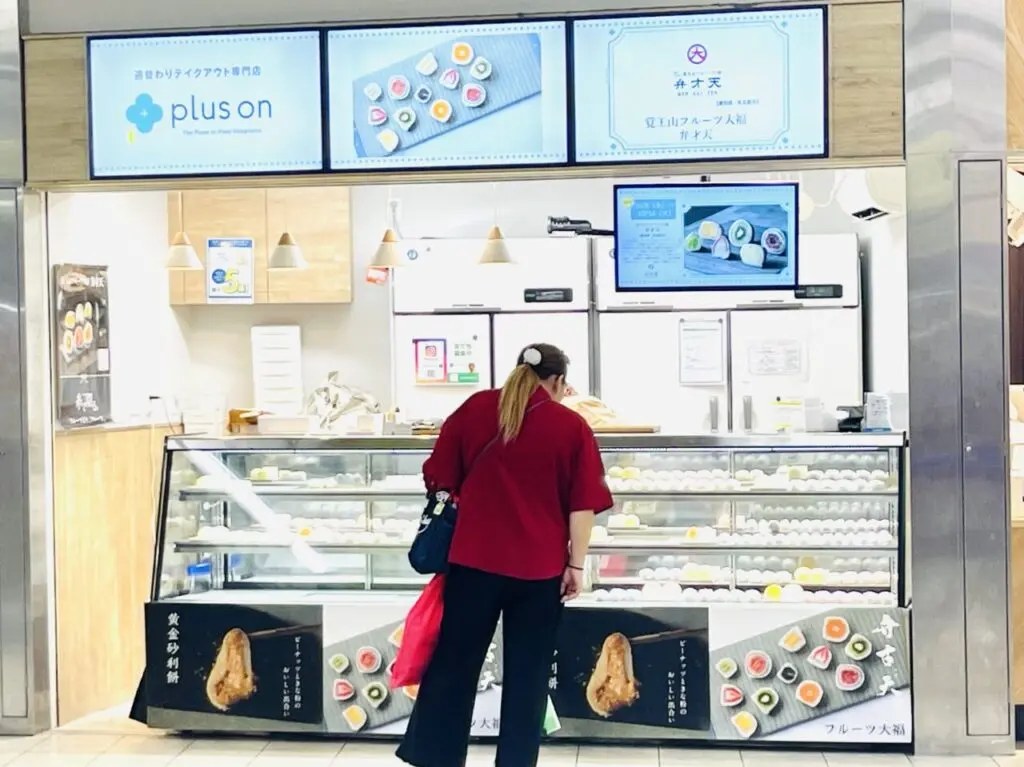 南海新今宮駅の構内にあり、和菓子や洋菓子などの食品を週替わりで販売するショップ「plus on 南海新今宮駅」では、2025年10月8日から、色とりどりの各種フルーツ大福を販売しています。