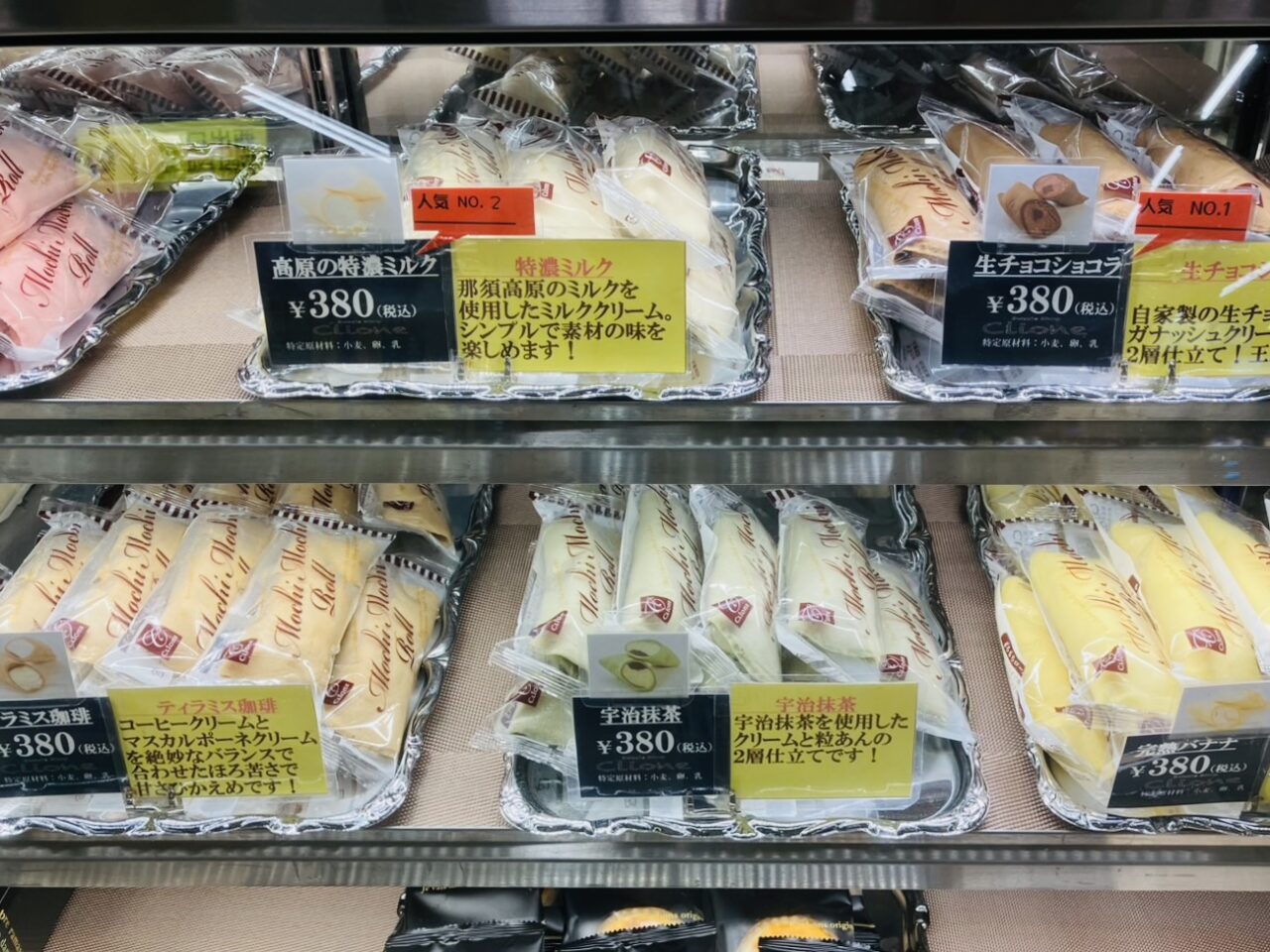 南海新今宮駅の構内にあり、和菓子や洋菓子などの食品を週替わりで販売するショップ「plus on 南海新今宮店」では、2025年10月22日から、宇都宮の洋菓子店「CLIONE(クリオネ)」が出店しています。もちもちロール9種類、ハワイアン生ドーナツ8種類、エッグタルト18種類がショーケースに並んでいます。