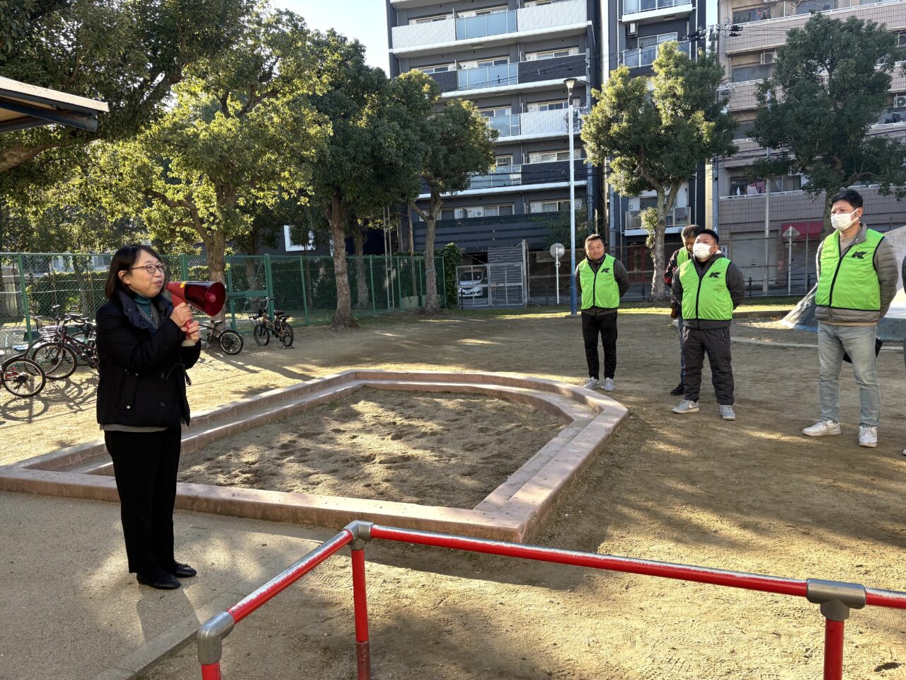午前9時、集合場所となった恵美公園には、多くの参加者が続々と集まりました。挨拶に立った浪速区の松原真美副区長は「浪速区では最近、落書きが急増しており、景観を損ねるだけでなく、落書きしてもよいという雰囲気を生み、防犯上も大きな問題につながります」と説明。