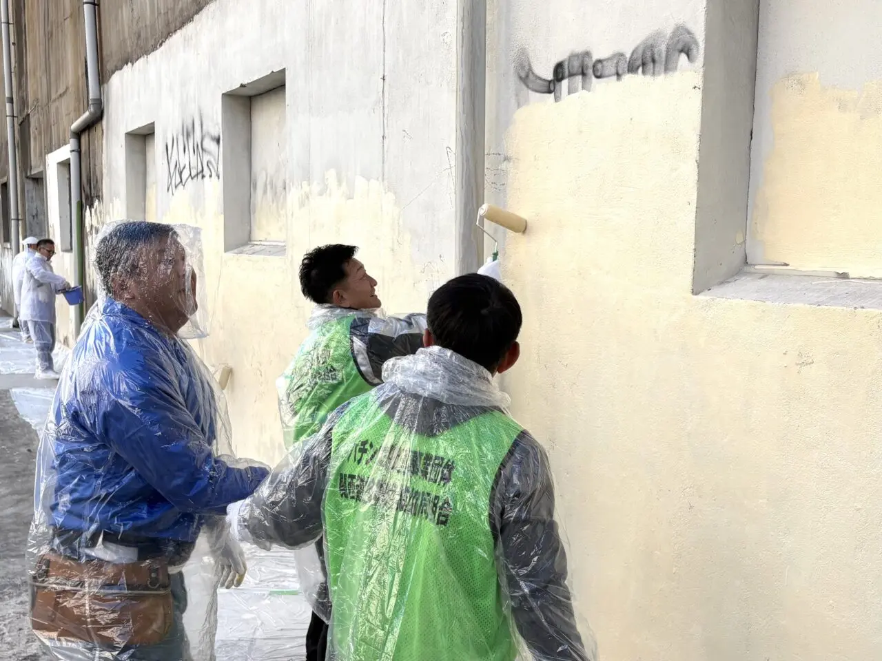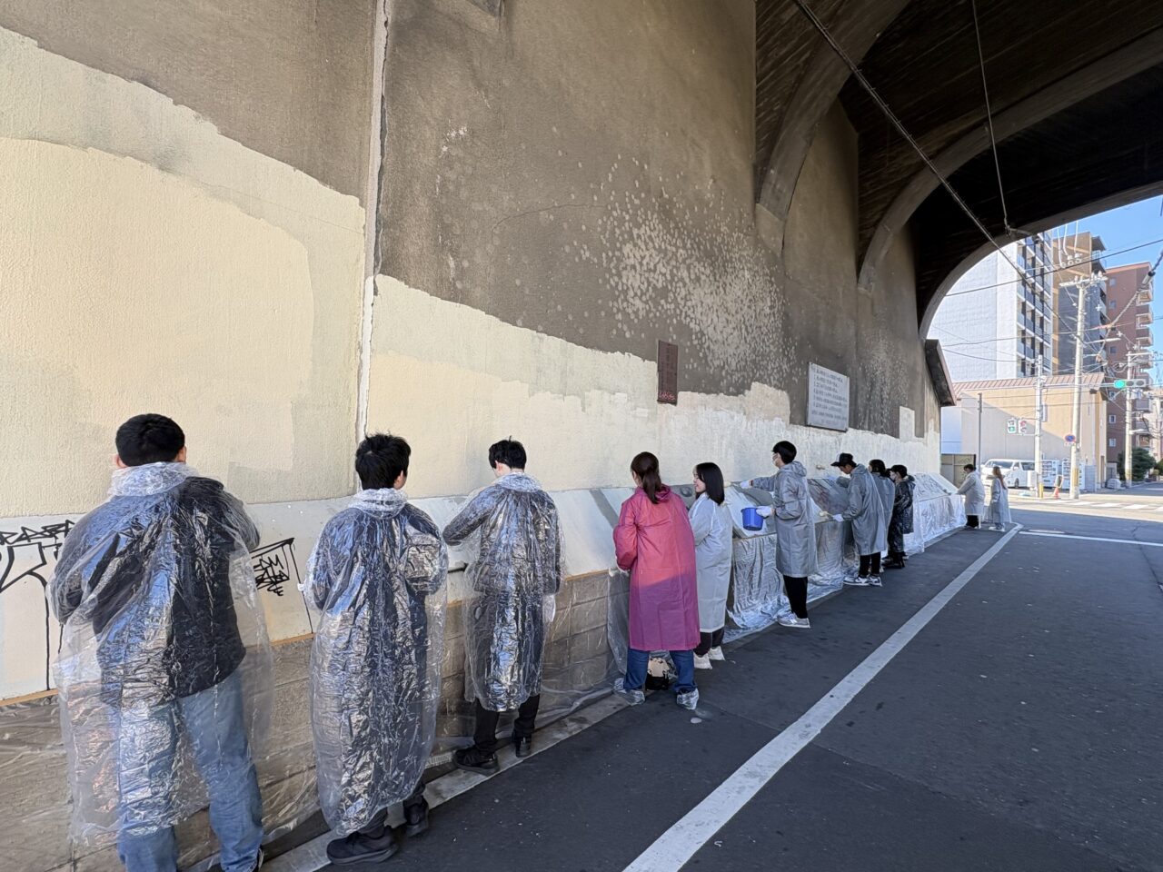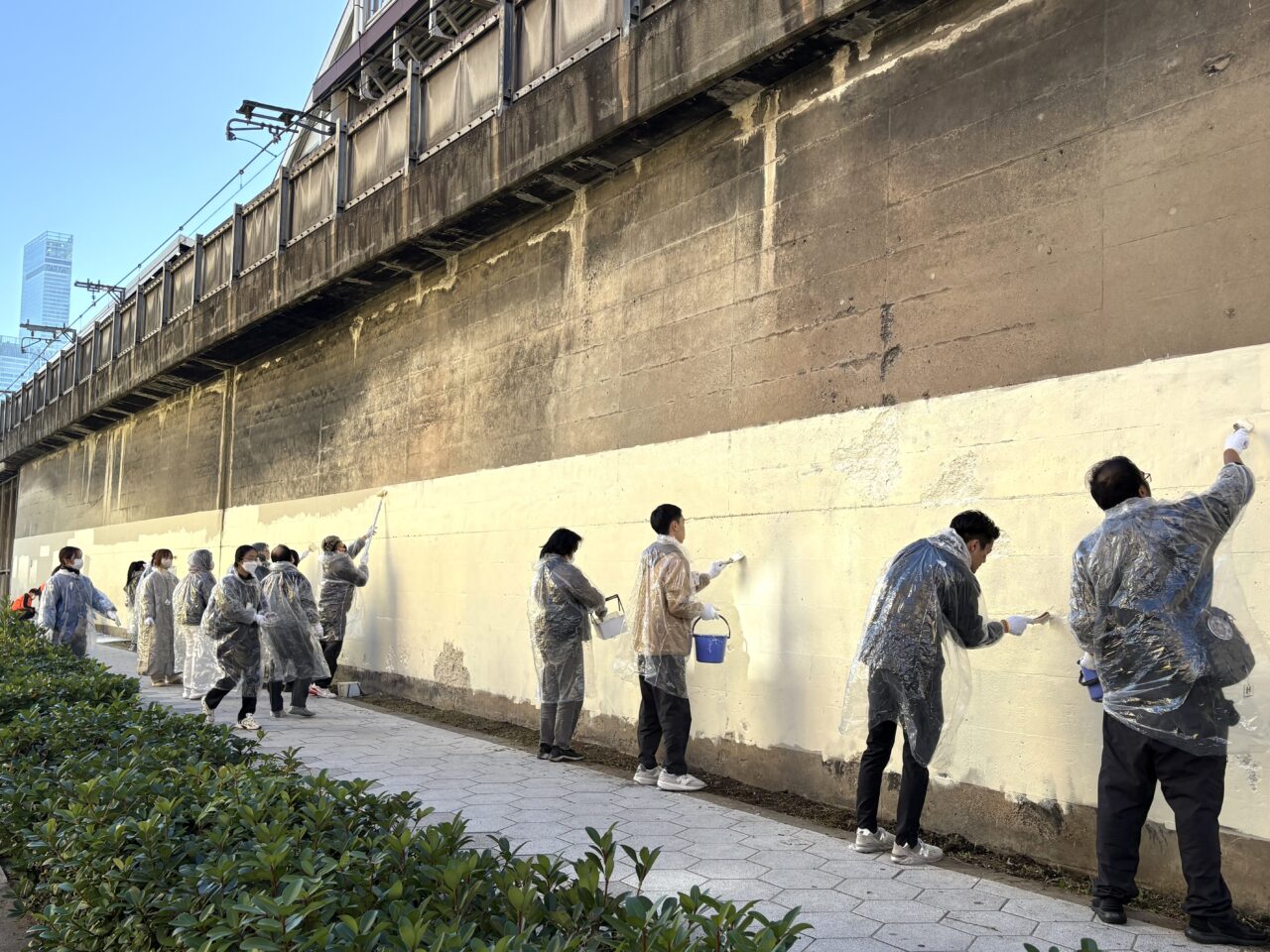 6つの班に分かれ、新今宮駅の北側エリアの高架下の壁面などに描かれた落書きを、ハケやローラーを使って丁寧に塗りつぶしていきました。