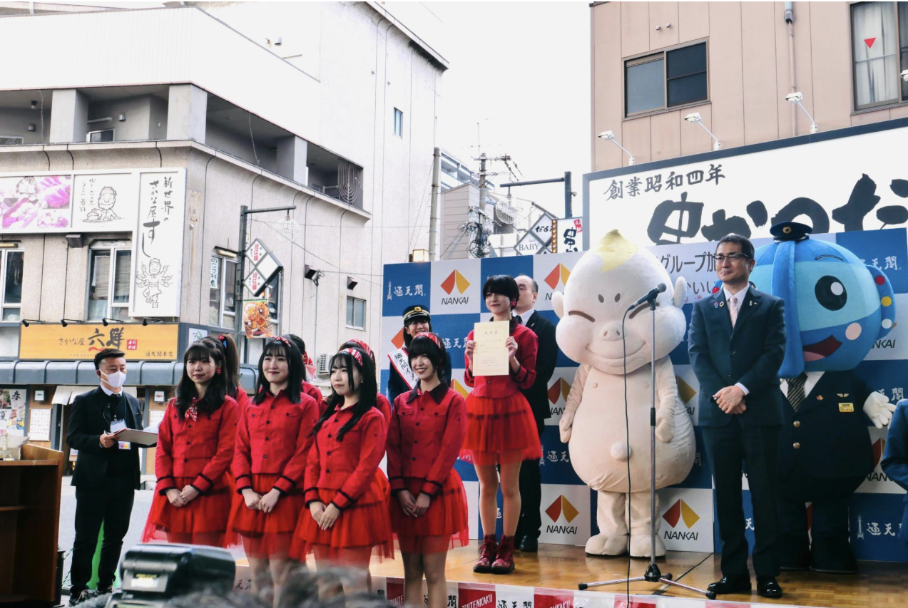 アイドルズは2024年12月4日、通天閣の南海グループ入りを記念した記者会見の場で、南海電鉄の岡嶋社長から直々にグレーターなんばチアーズに任命されました