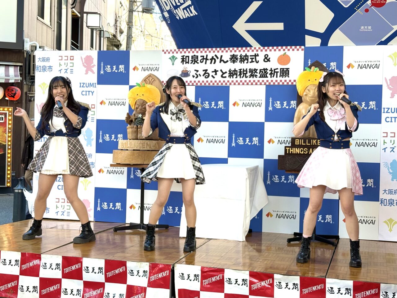 式典に先立ち、通天閣公式アイドル「アイドルズ」が登場。オリジナル曲『にどづけしないで』を披露し、会場を温めました。その後、和泉みかん奉納式が執り行われ、辻市長と振興会の3名の計4名により、和泉みかんが奉納されました。
