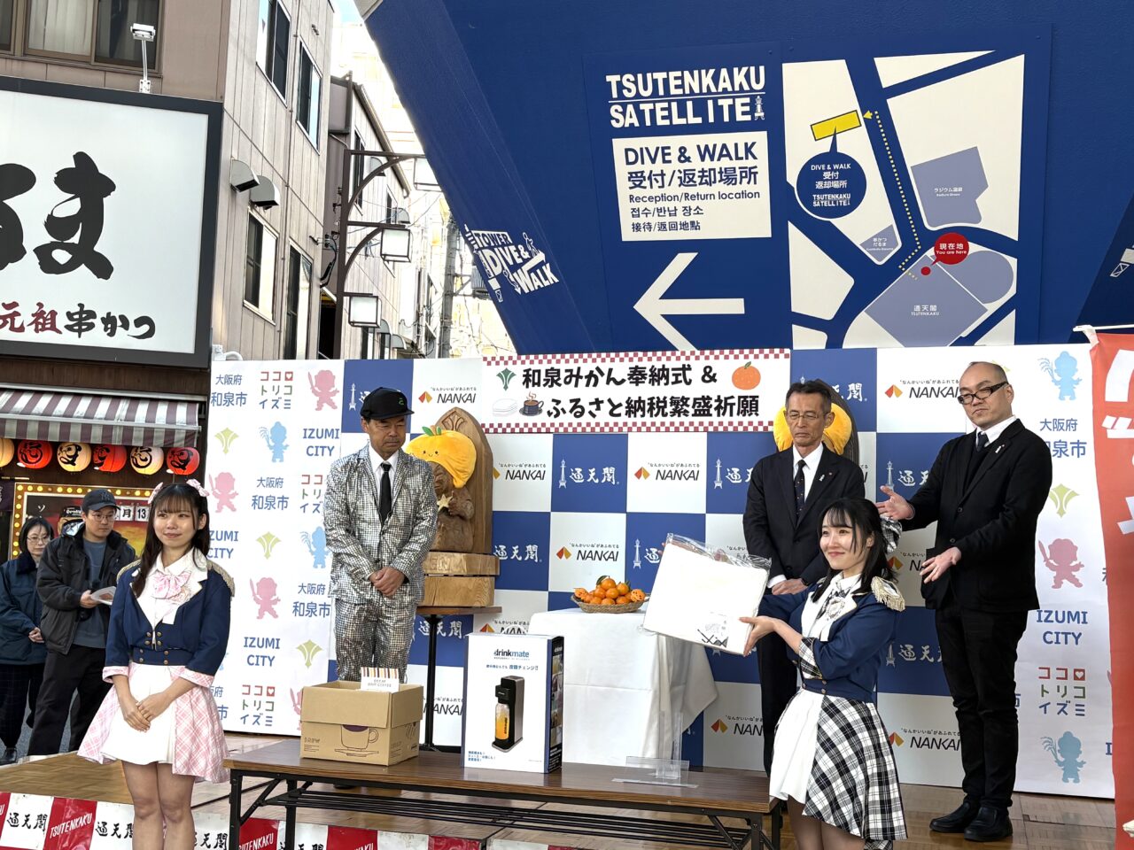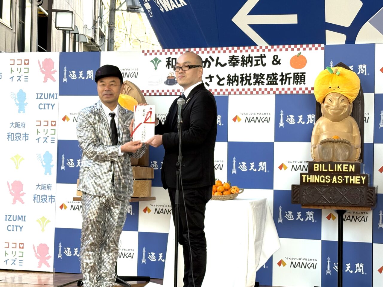 通天閣前の広場にて「和泉みかん奉納式&ふるさと納税繁盛祈願」が2025年12月13日に行われました。本イベントは、和泉みかんの振興と繁栄を祈願し、幸運の守り神として親しまれているビリケンさんに和泉みかんを奉納するとともに、和泉市へのふるさと納税がより多く寄せられることを願って開催されたもので、当日は和泉市の辻宏康市長自らがビリケンさんに祈願を行いました。
