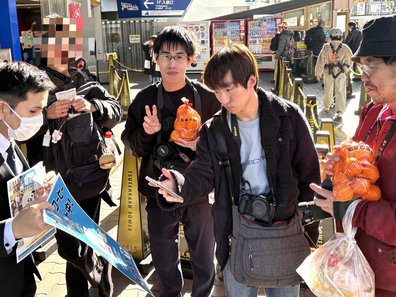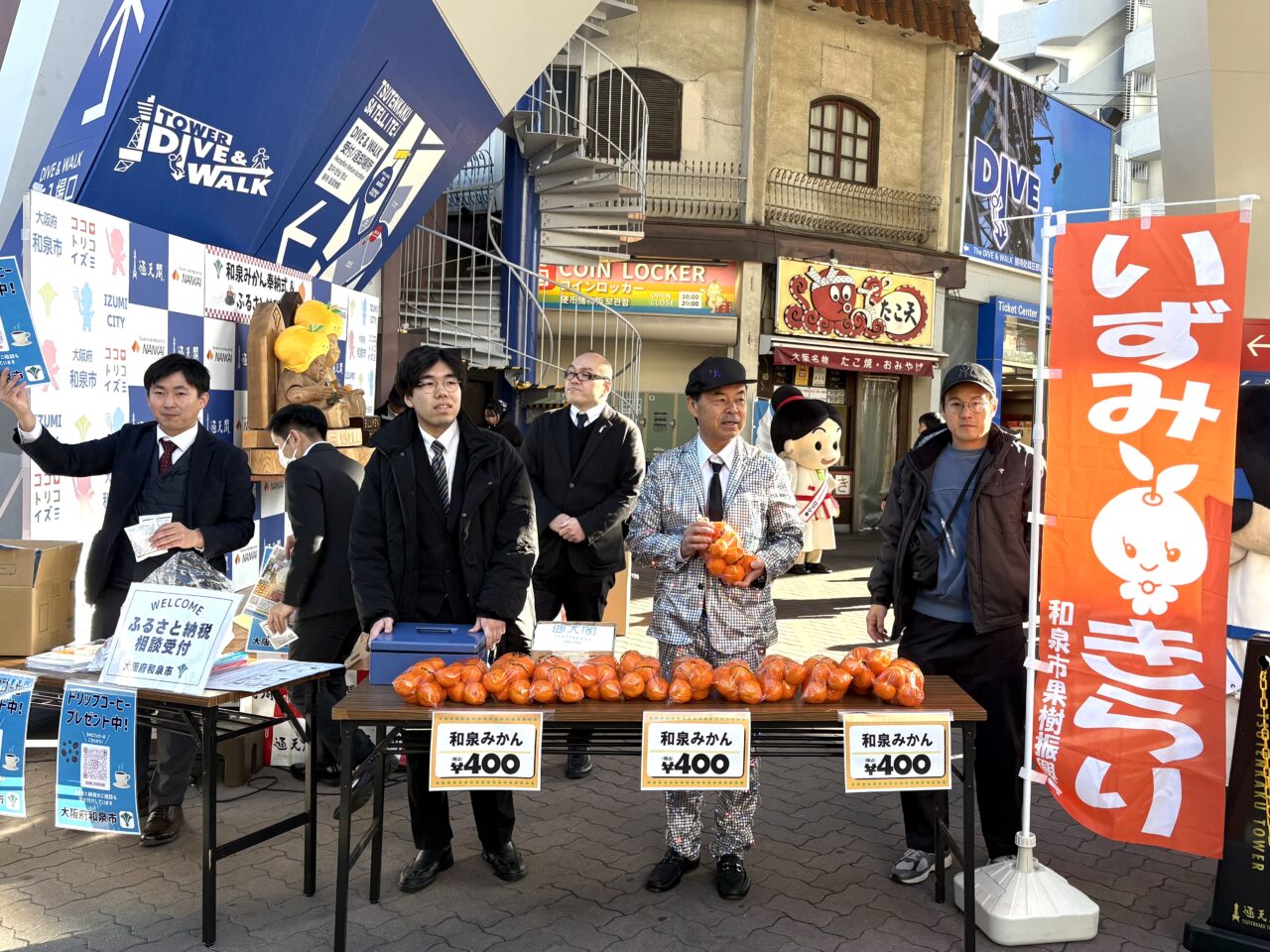 和泉市は、大阪府内でみかんの生産量が最も多い一方で、まだ知名度が十分とは言えません。そこで今回、観光客や通行人でにぎわう通天閣で、和泉みかんの魅力を直接伝えるとともに、ふるさと納税を通じて市を応援してもらうきっかけづくりを行いました。
