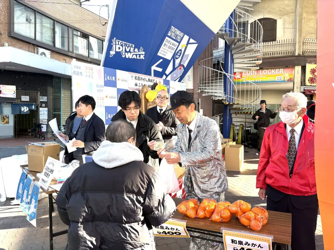 イベント終了後には、その場で和泉みかんの即売会とふるさと納税相談コーナーが開設されました。その場では和泉市の方々による試食みかんの配布も行われ、通行人の方が受け取って食べていました。即売会では、辻市長自らが一袋400円で和泉みかんを販売。