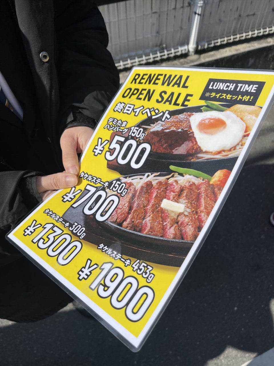 【大阪市浪速区】「1ポンドのステーキハンバーグタケル日本橋オタロード店」がリニューアル記念で2/21と2/22の2日間、限定セール! ハンバーグ150g・500円、ステーキ150g・700円で提供されます