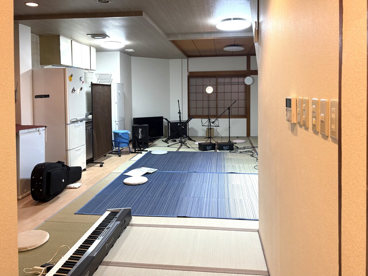 ミキサーやスピーカーに加え、キッチンや冷蔵庫も備え付けられており、小規模ながら音楽イベントから各種教室、展示会など幅広い用途に活用できる空間となっています。