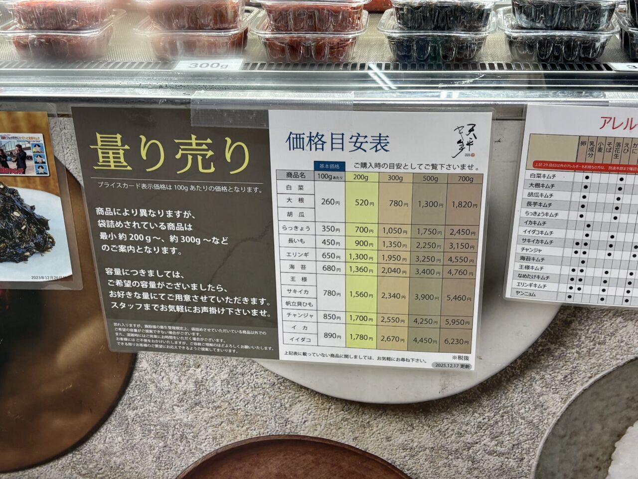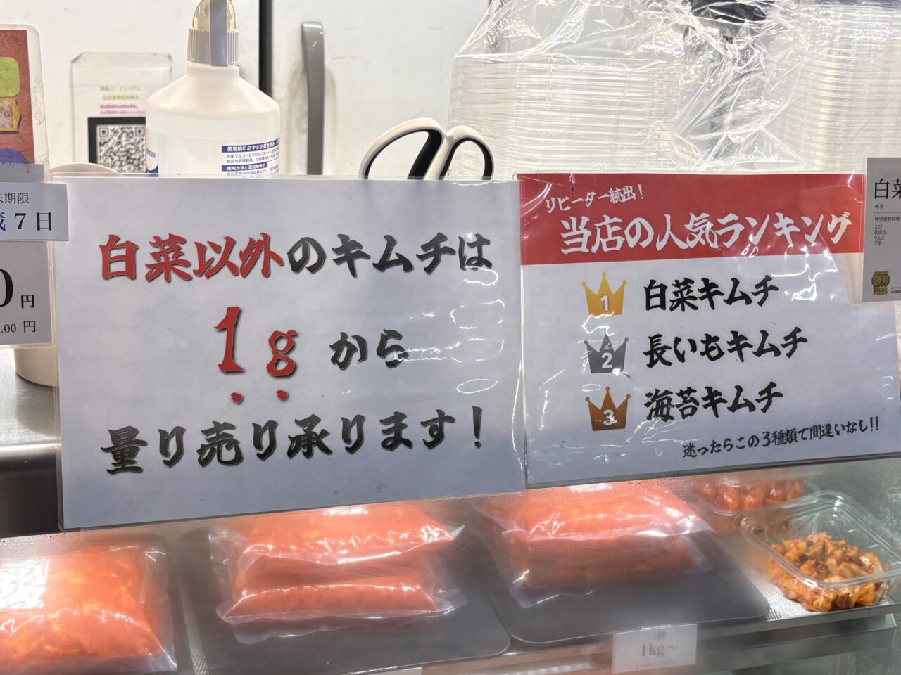 他にも長芋キムチ、海苔キムチ、チャンジャなど8種類がそろっています。量り売りで気軽に少量から買い求めることができるのも魅力的です。