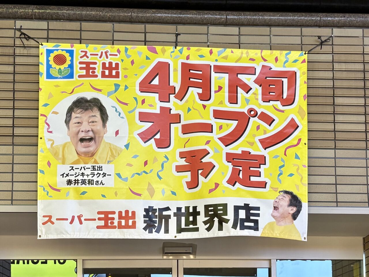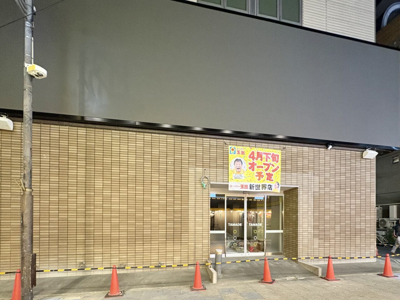 現地にはすでに「スーパー玉出 新世界店 4月下旬オープン予定」とのお知らせが掲出されており、着々と準備が進んでいる様子です。